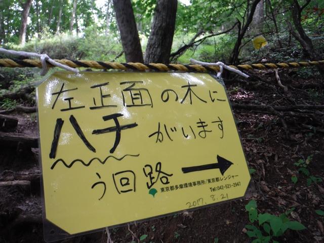 惣岳山山頂より奥多摩湖側に100m地点に蜂の巣があり迂回路に。迂回路はステップなどきっていなく非常に滑りやすい。