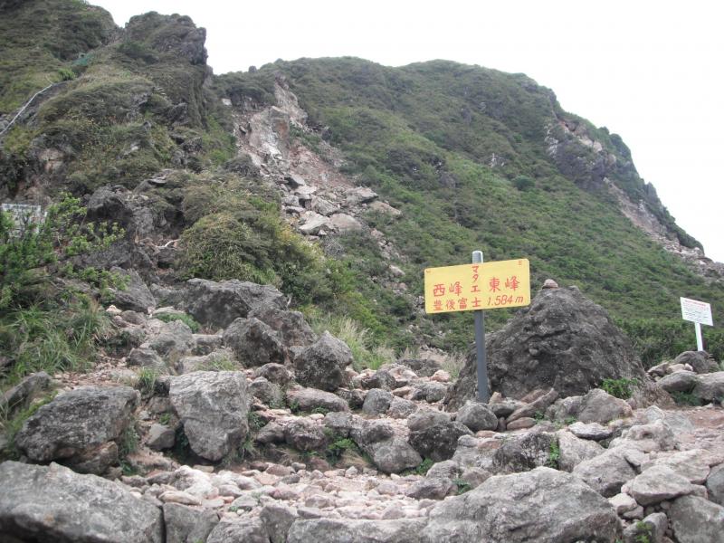 さて先ずは西峰へ。なかなか手ごわいクサリ場!15分くらいで山頂ですが北アルプスの岩場のような気分を味わえました。西峰からはお鉢廻りへ!これまでの整備された登山道よりやや困難な道となります。草をかき分け前進!登るのは登れるけれどどっち行ったらいいの?となる岩場に苦戦。登山口に「お鉢廻りは充分注意して下さい!」と書いてあるだけのことはあります。