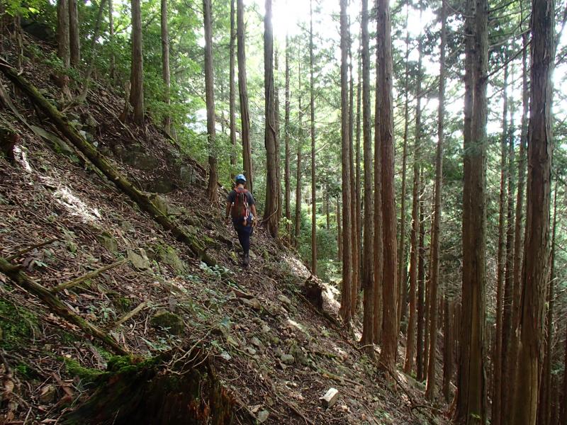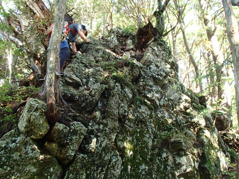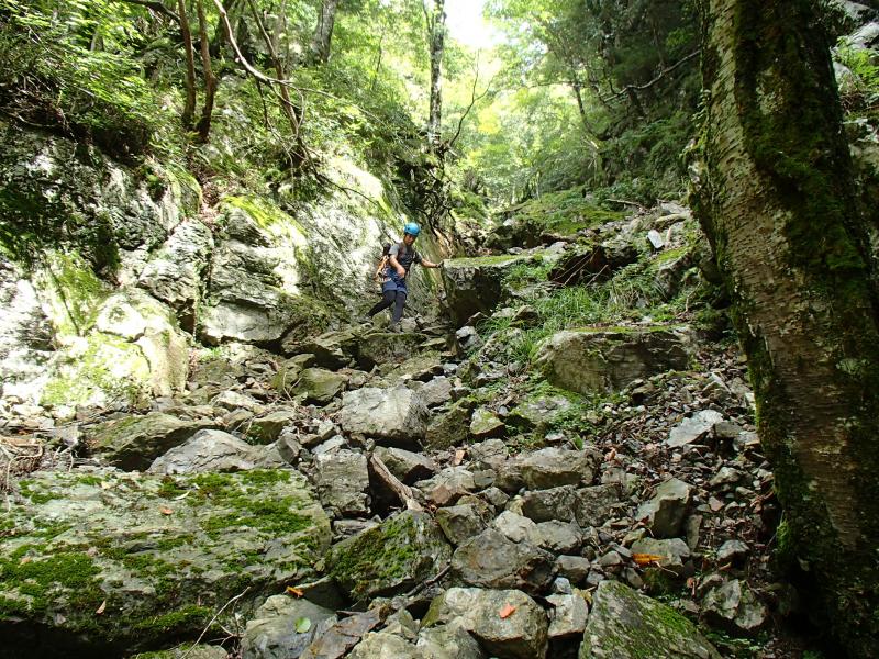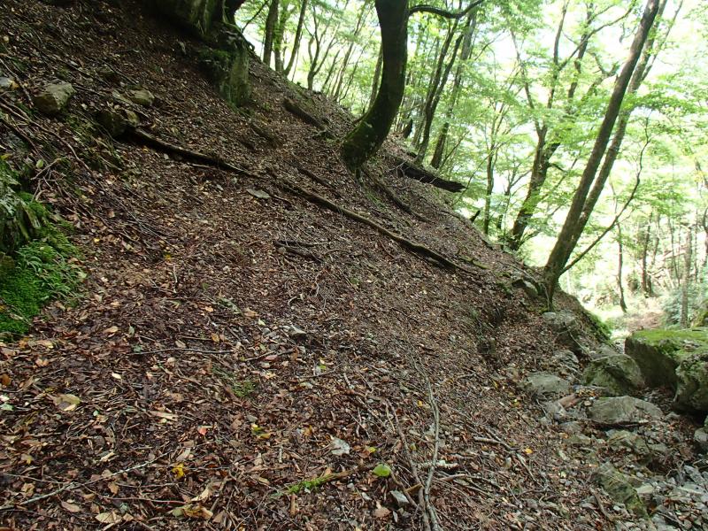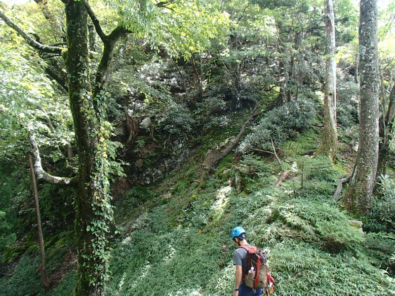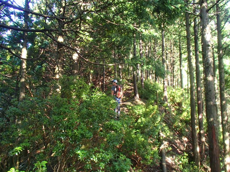 尾根上の岩場から逃げるためにガレたルンゼを下ったのですが、谷から尾根へ戻るタイミングがつかめなかったのですが、少し広がった谷底の地形からシカ道が斜面をトラバースし尾根に戻っていく個所を発見。たどるとばっちり岩尾根を抜けたところに出ました。