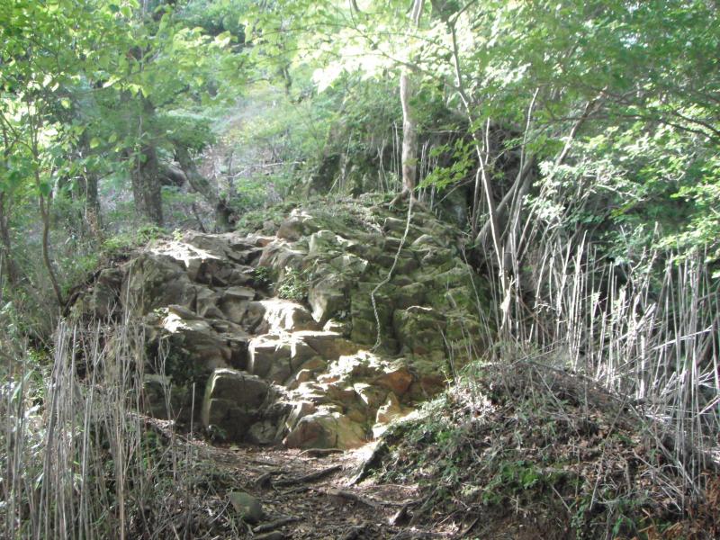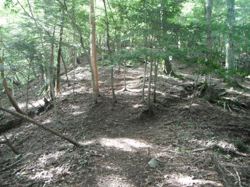 が、五合目小屋から先はなかなかの急登。始めのうちは階段、そして樹林帯の中をひいこらいいながら稜線分岐の国見峠まで登っていきます。ロープの張られた岩場などもあり気は抜けません。「あとひといき!」の看板から30分くらいかかって国見峠到着。気持ちのいい草原です。エネルギーを補給しつつ休憩しました。