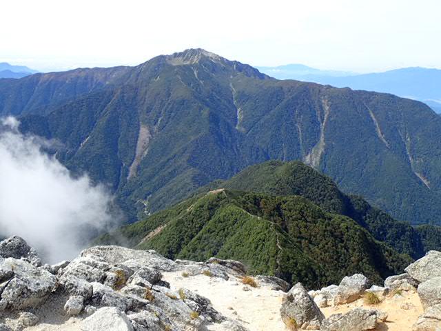 ヒィヒィ言いながら駒津峰に到着。鋸岳の岩々しい風貌を見て息を整え、すぐに出発。痩せ尾根は地味にアップダウンがあり、どうしても時間を取られる。直登ルートと巻き道ルートがあるが、迷わず巻き道へ。花崗岩の砕けた白い砂礫帯は、なかなか堪える。ちょっと渋滞が起きていたくらいだ。摩利支天との分岐辺りで、今日は寄らないことを決定。それより、ちょっとガスが上がって来たので早く山頂へ行かなくては!