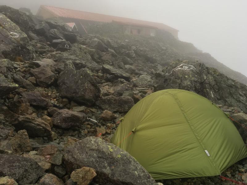 片足がジャブジャブの状態で歩行を続行。その後は槍ヶ岳山荘手前で心が折れてしまい、初日は殺生ヒュッテでテント泊をする事に。悪天候のせいもあり、夜は思った以上に冷え込みました。