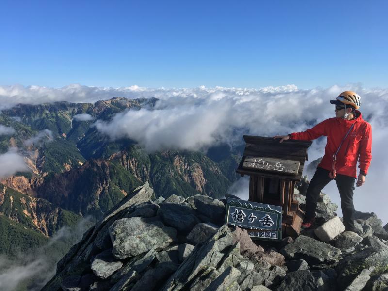 槍ヶ岳山荘に着く頃には青空に変わり快晴、槍ヶ岳山頂へアタック。平日の朝だった事もあり、山頂への岩場で混雑する事なく上がる事ができました。