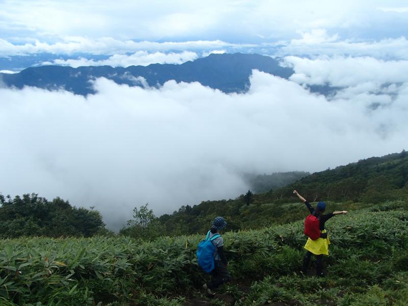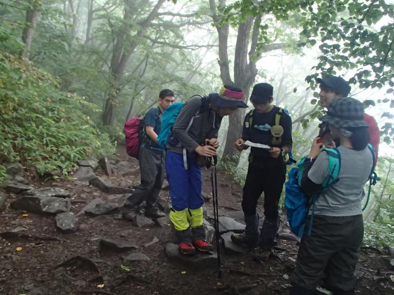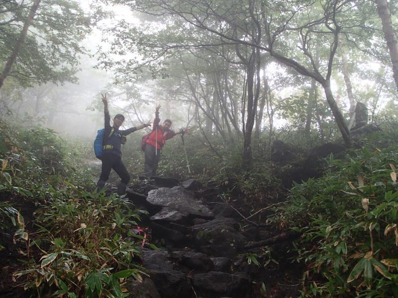 ・しばらく歩いて西コースとの分岐に近づくと樹林帯を抜け、やっと展望が得られます。ここで!なんと分厚く覆っていた雨雲が少し晴れ、素晴らしい眺望が少しの間得られました!!これには参加者全員の歓声が響きました。ちょうど分岐に近かったので、しばしこの眺望を楽しみました。