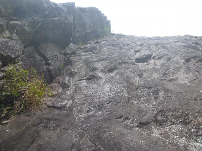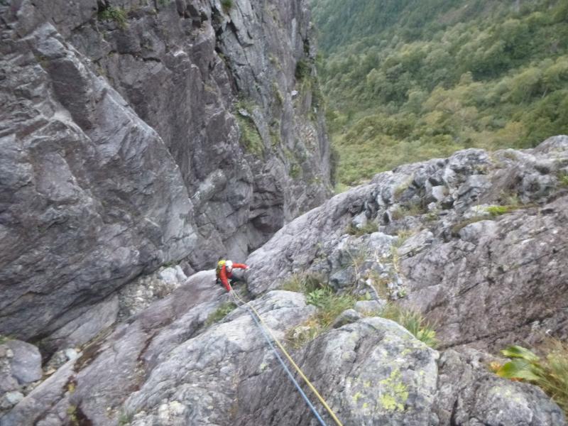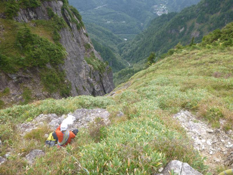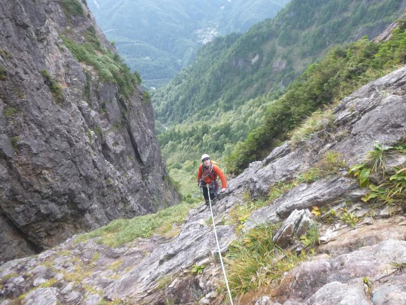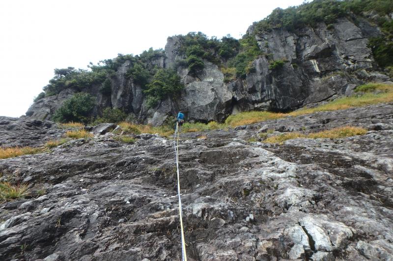 フェースを抜けたら緩傾斜のスラブを駆け上り、1ピッチのトラバースをして