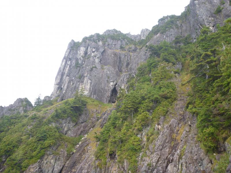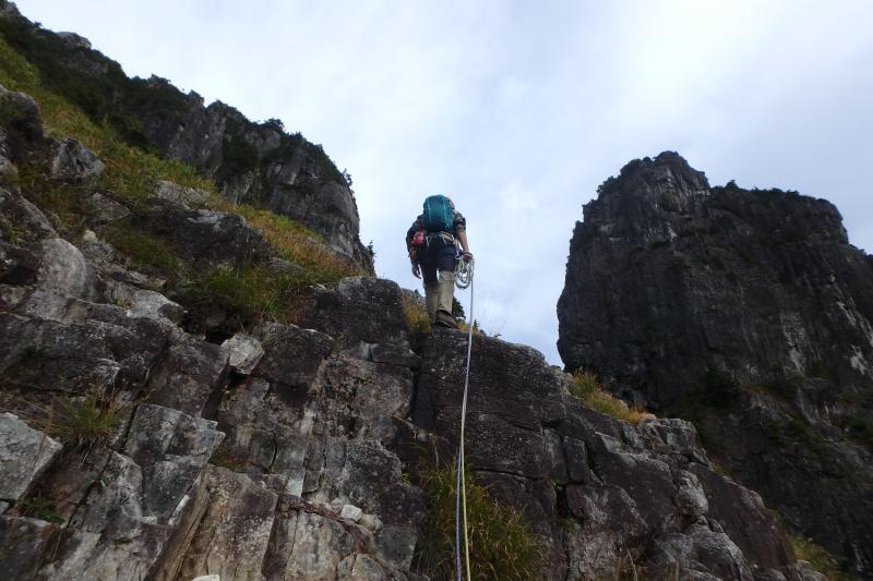 草付の斜面を歩き、本峰フェースや草付ルンゼを経て山頂に至る10ピッチほどの