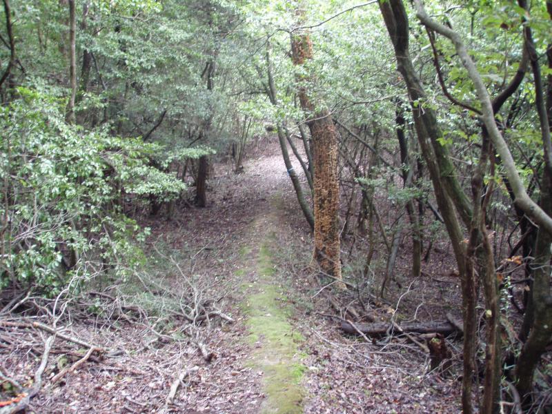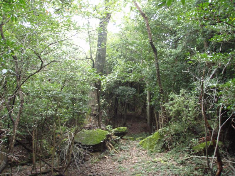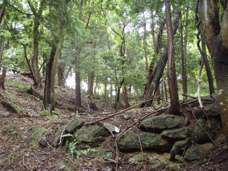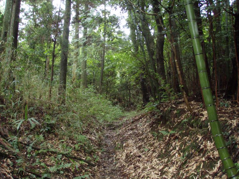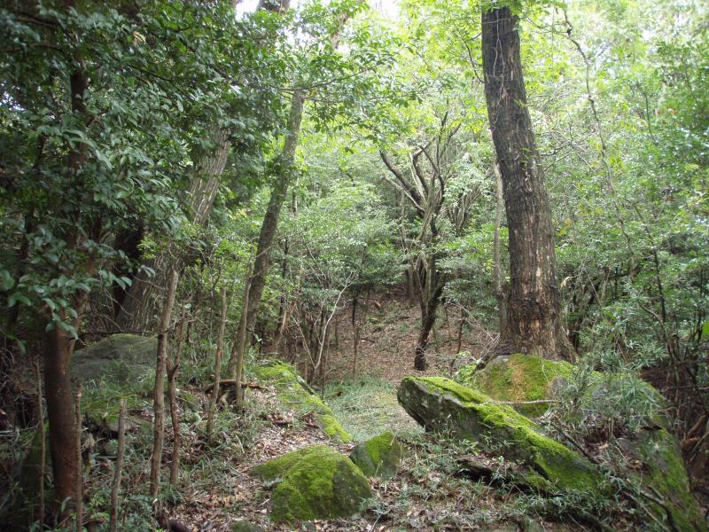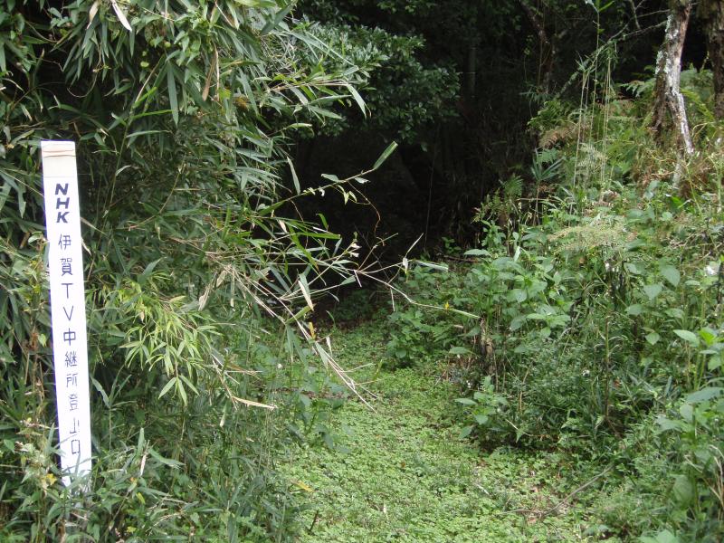 歴史ゆかりの神社を探索後、鳥居前の道を進んで行って「NHK伊賀TV中継所登山口」から入山。雨上がりで少し滑りやすくなった登山道を登って行くと、所々に苔むした大きな岩があり、一部石垣のようなものもありました。道自体は傾斜も緩めで歩きやすいものの、蜘蛛の巣が多く進むのに時間がかかります…。