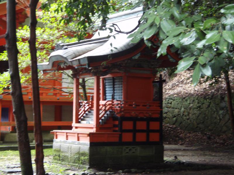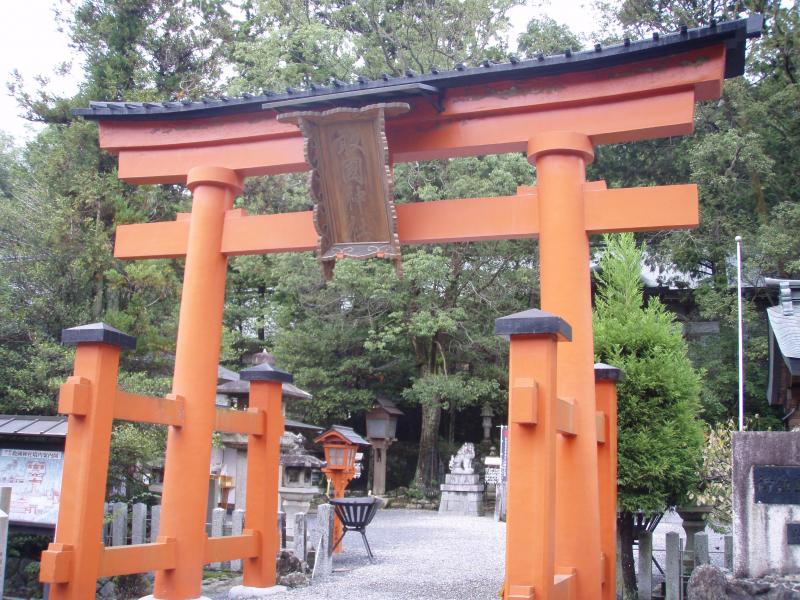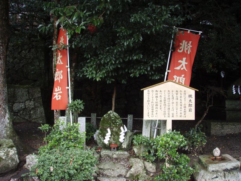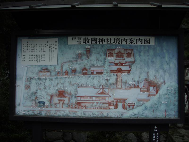 バス停・敢国神社から出発。表参道から入って立派な鳥居をくぐり、まずは参拝。「桃太郎岩」横の階段の上に拝殿があり、さらに上の本殿の東側にある「六所社」では甲賀三郎兼家を祀っているとの事。裏参道を下って行く途中にある階段を上がると、服部家と繋がりのある楠木正成を祀る「楠社」と縁結びの「結社」あり。
