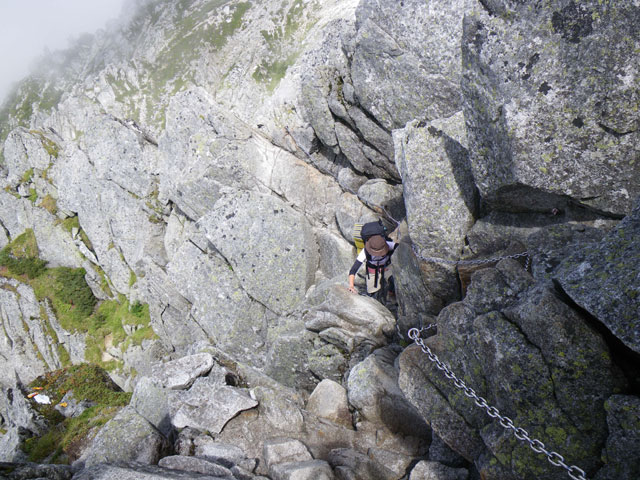 宝剣岳へは登りだしてすぐ鎖場になります。ルートが狭いので、休日だと登り下りで混雑が予想されます。高度感はありますが、3点支持を守り慎重に通過しましょう。