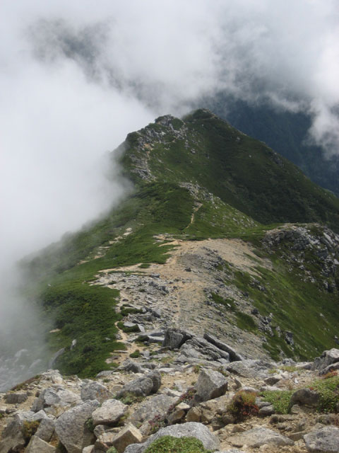 中岳へ向かう途中に巻き道ルートへの分岐があります。このルートの危険箇所は短いので、慎重に通過すれば時間短縮することができます。でも、時間があるなら中岳からの木曽駒ケ岳も見ると良いのではないでしょうか。
