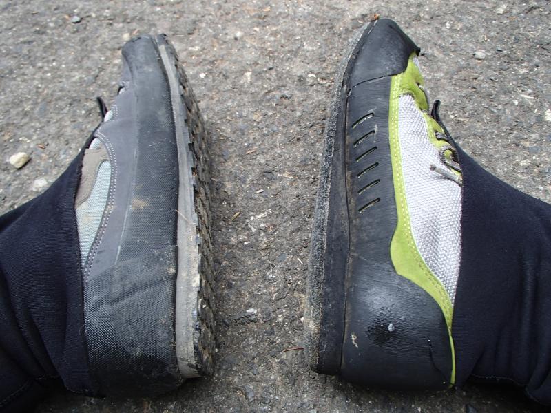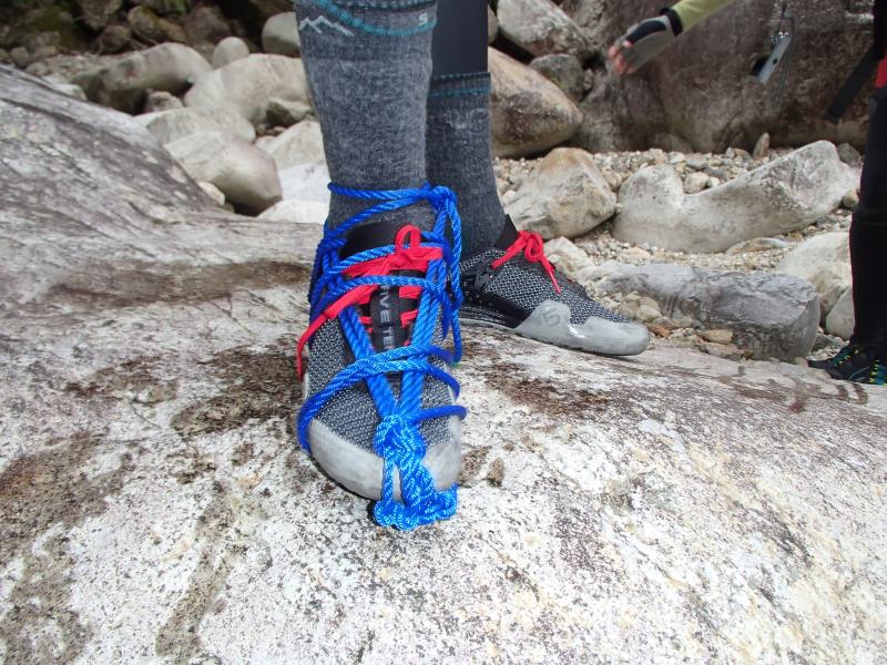 ・天気はイマイチながら、みんな笑顔で入渓点へ。ここで、杤尾さまは自作のわらじを靴に装着し始めます。何となくマジマジと見ているうちに、自分は片足フエルトソール、片足はラバーソールにしていたので、三者三様の効きを確かめられる!とかまた楽しくなってきました。