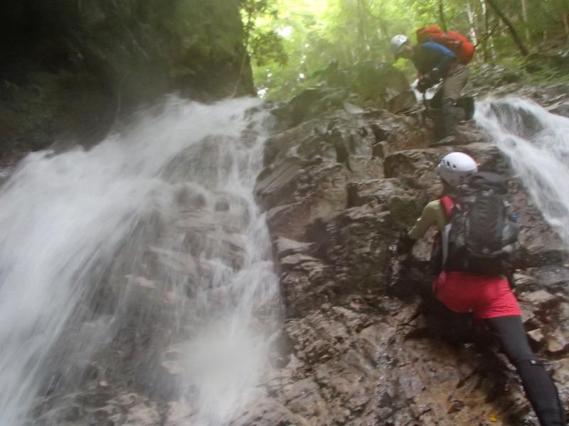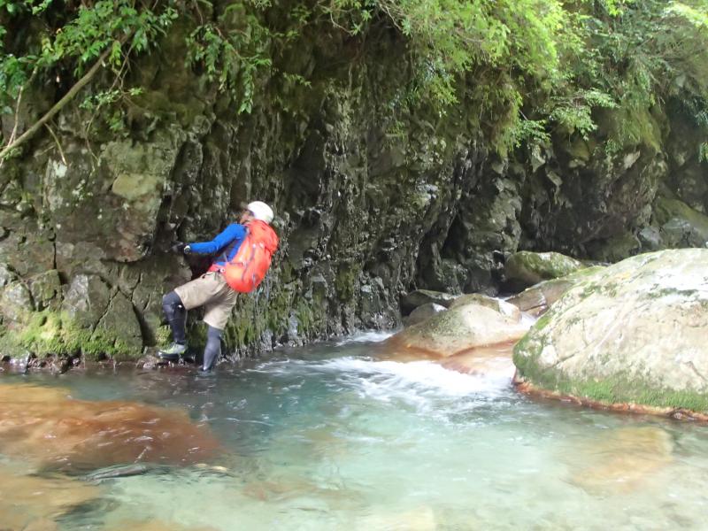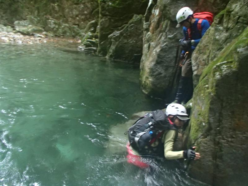 ・一通り楽しんだので先へ進みます。二股の滝の間を全員無事に登りザブザブと進んで行くと、前方に泳ぎ必須のエリアが出現!ただ、水温も低く天気も悪いのでできるだけ水に浸かりたくないメンバー。必死のヘツリにチャレンジです。