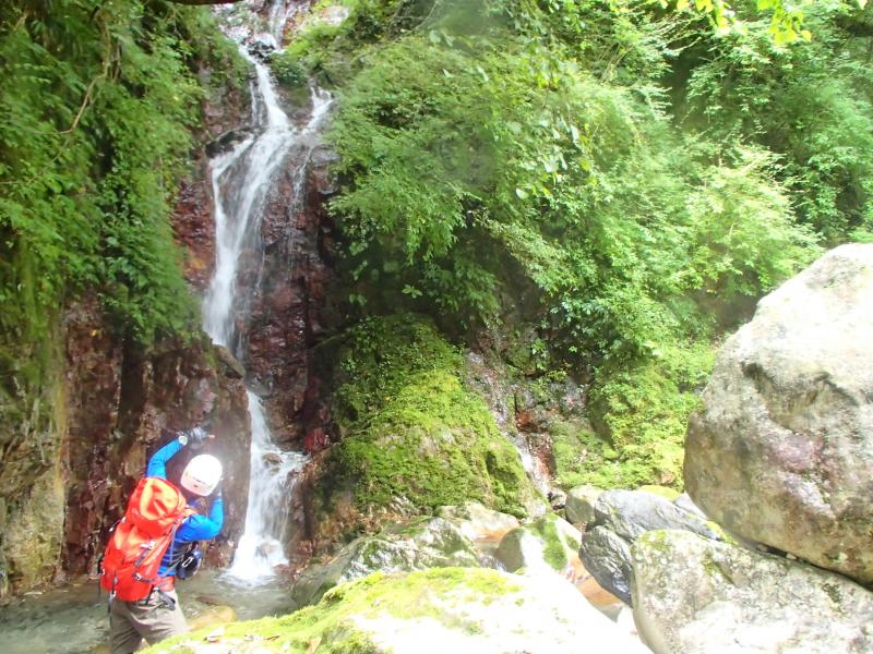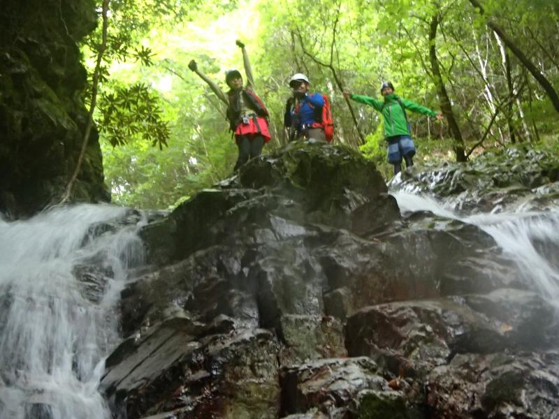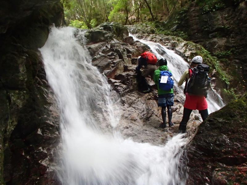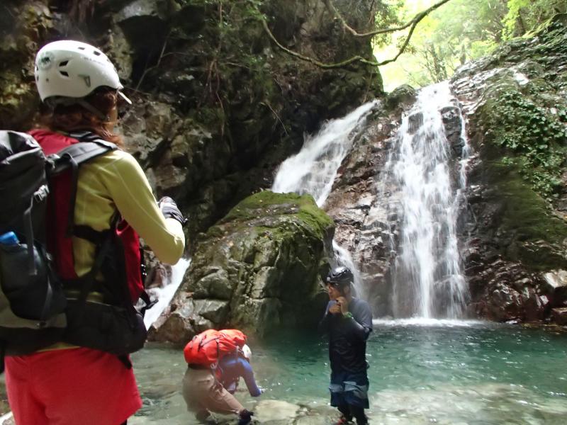 ・途中、二股に落ちる滝があったので、休憩がてらにお楽しみタイム!やんちゃな杤尾さまが滝の間を登ってダイブ!色々写真を撮り合って楽しみました。