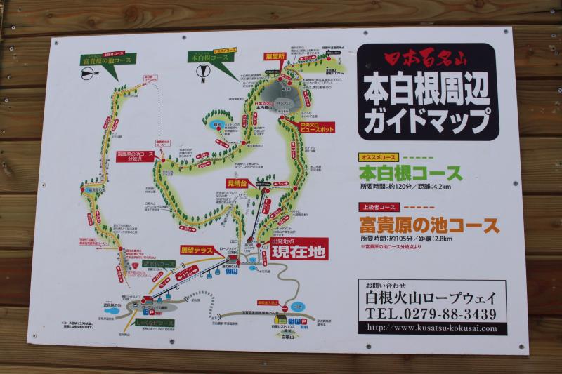 - 白根レストハウス駐車場<100分>本白根山最高地点<40分>鏡池<80分>駐車場<15分>湯釜<10分>駐車場
