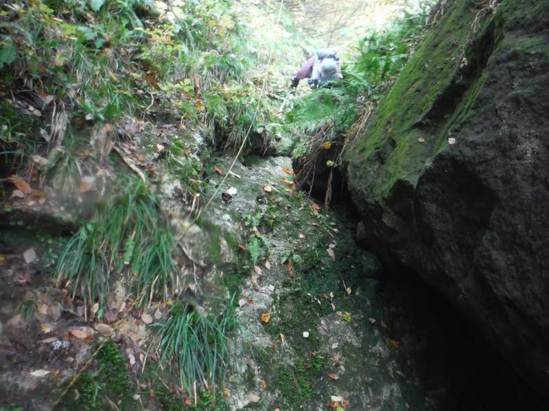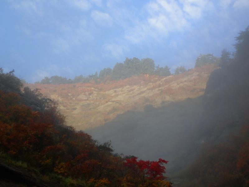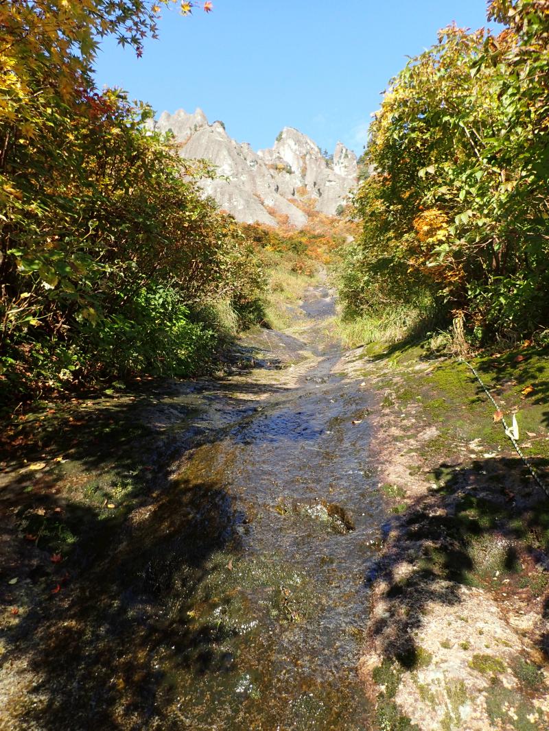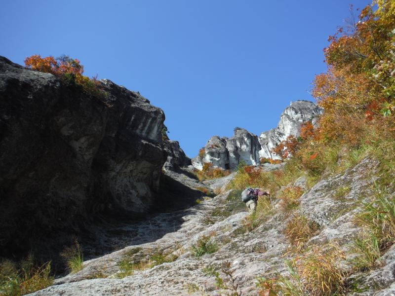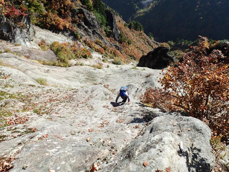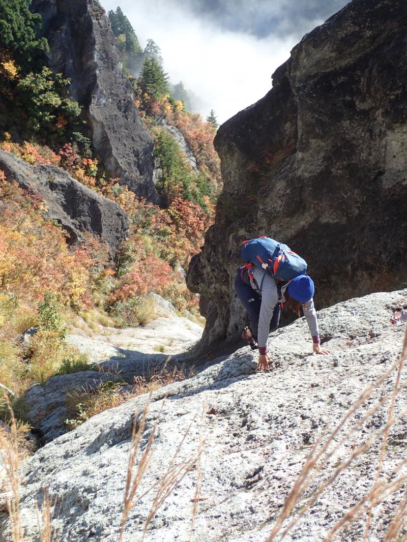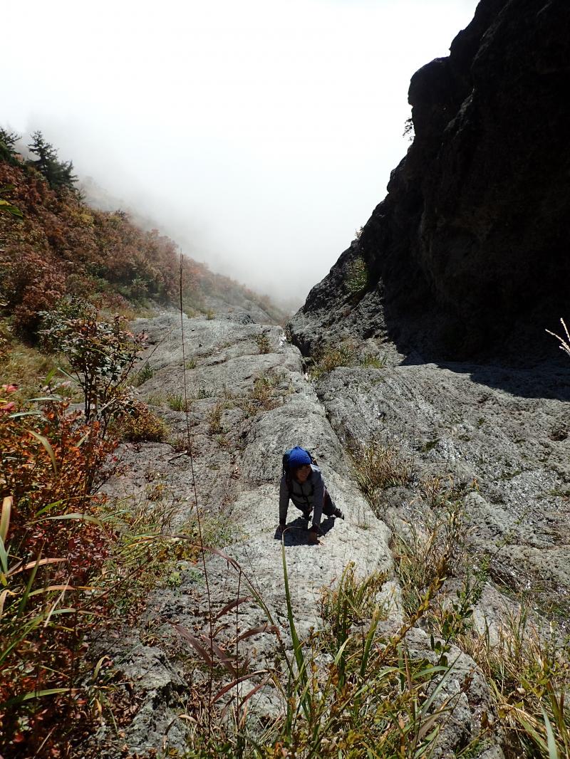スラブに出る前の沢沿いの道は濡れていて、朴の大きな落ち葉で踏み跡が隠れて歩きにくいことこの上なし。私は2回ほどずるっと滑落しかけて冷や冷やでした。泥んこトラバースは苦手です。朝靄が次第に薄くなっていき対岸の岩壁が怪しくその姿を現し始めると、いやらしいへつりもやっと終わり、滝が見えて渡渉した先にシジミ沢の登りが待っていました。始めは苔むした大岩を全身で登り、ゴロゴロが滑らかになって来ると、上部に写真で見たことのある岩峰群が。あのどれかの基部に御前ヶ遊窟があるんだ!わくわくしながらスラブに取りかかりました。