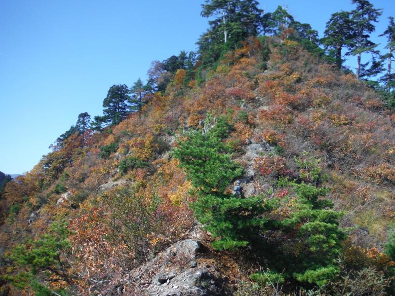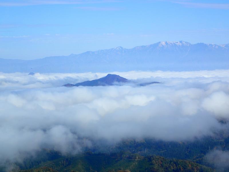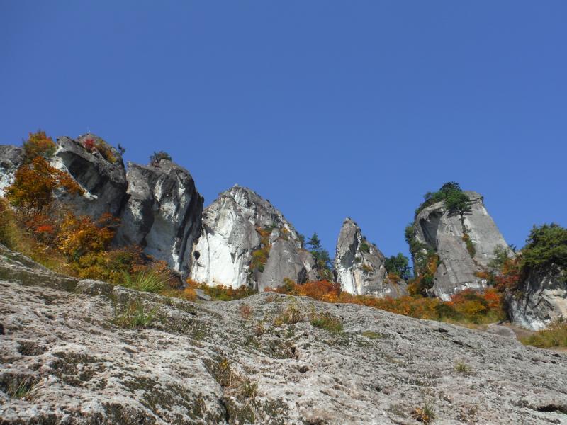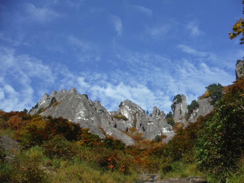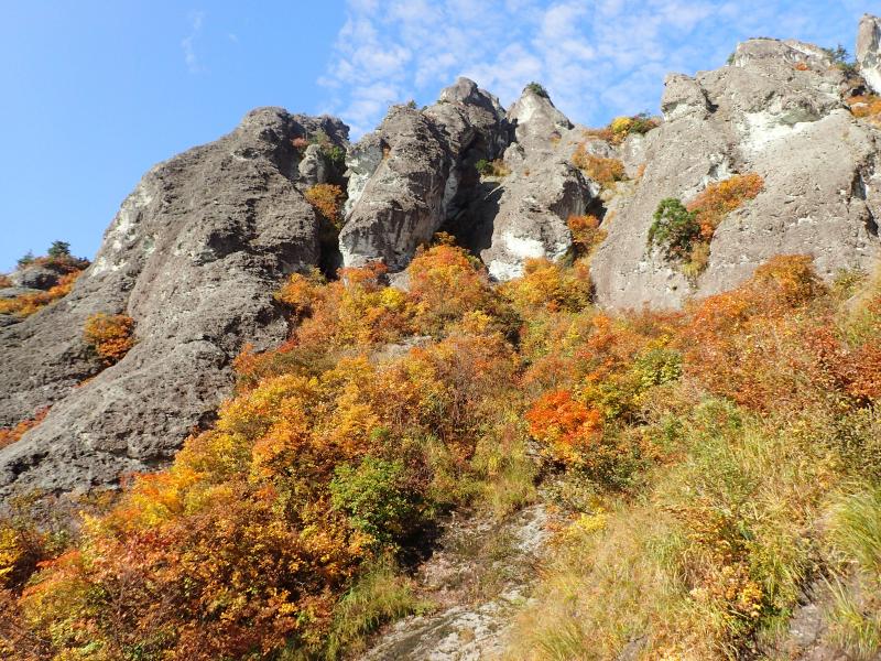 夢中で登り続けふと見上げると目の前に大きな岩屋が。二つの岩屋が並んでいて左の方に仏像が祀ってあり、壁に観音様?が埋め込まれていました。どうやらここが御前ヶ遊窟のようです。伝説が本当かどうかはわかりませんが、何となく神秘的なパワースポット的な空気を感じました。遊窟の左をさらに登りトラバースしてようやくスラブ終了、尾根に出ました。核心が終わってほっとして振り返ると素晴らしい景色が広がっていました。白い岩肌に赤と黄色の紅葉が彩を添え、雲海の向こうには磐梯山と雪を被った飯豊連峰。これでもかと絶景を詰め込んだかのような景観でした。