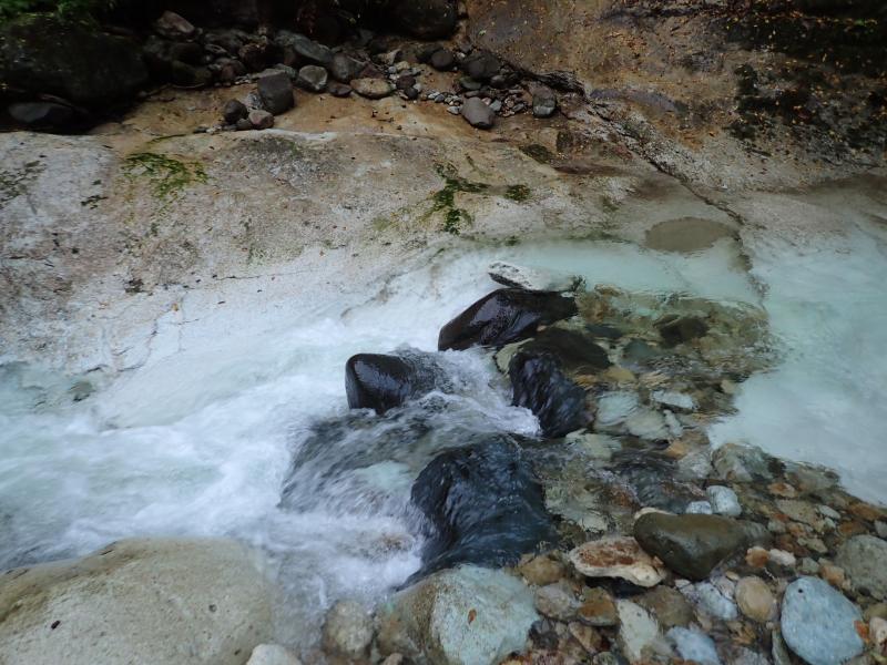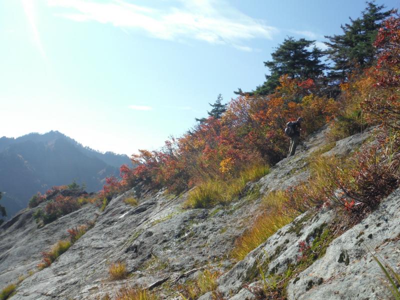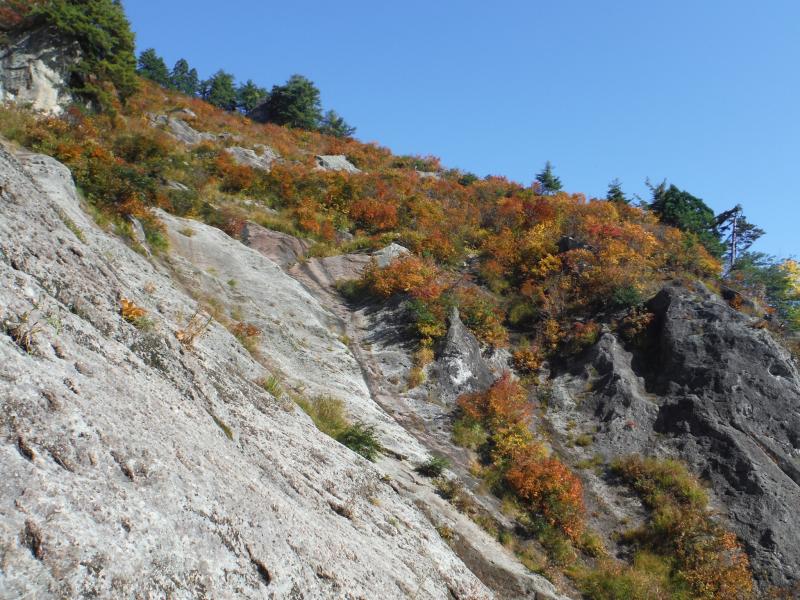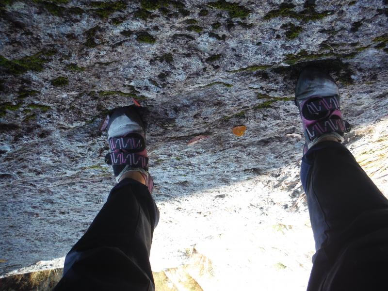 始めは濡れていてロープもあったのですが、標高が上がると岩も乾き何故かロープも無くなっていきました。このスラブを靴のフリクションだけで思い切り楽しんで!と言わんばかりに。ならばここでクライミングシューズにチェンジ。そしてスラブのど真ん中を登ってみる・・・落ちたら止まらない・・・もう気分はクライマーズハイ!!それにしてもクライミングシューズの安心感といったら!ここを登る方はフリクション抜群の靴をご用意ください!