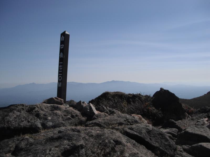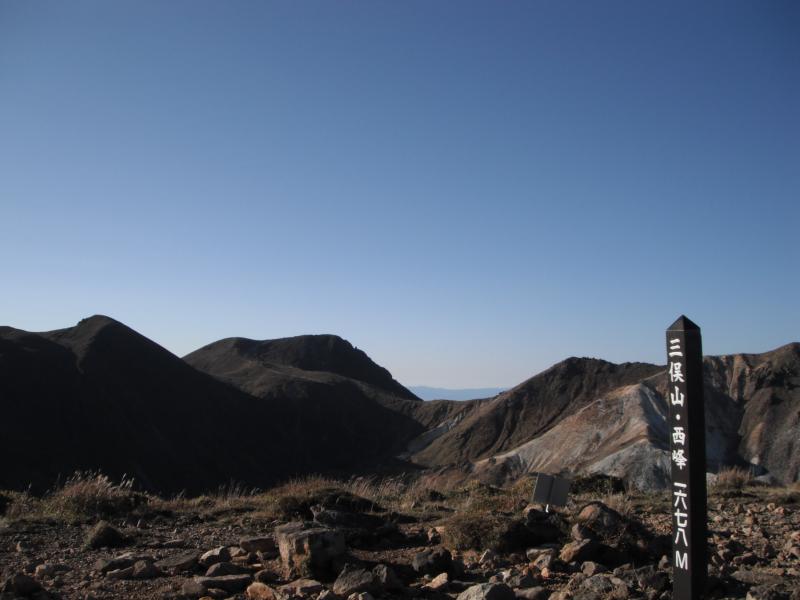 鉾立峠にもどり、本日の目標、白口岳を目指します。これがきつかった!「滑らさずにはおかん!」という固い意志さえ感じさせる登山道に四苦八苦。岩場も出てきてやっとこさ山頂に到着。しんどかった。
