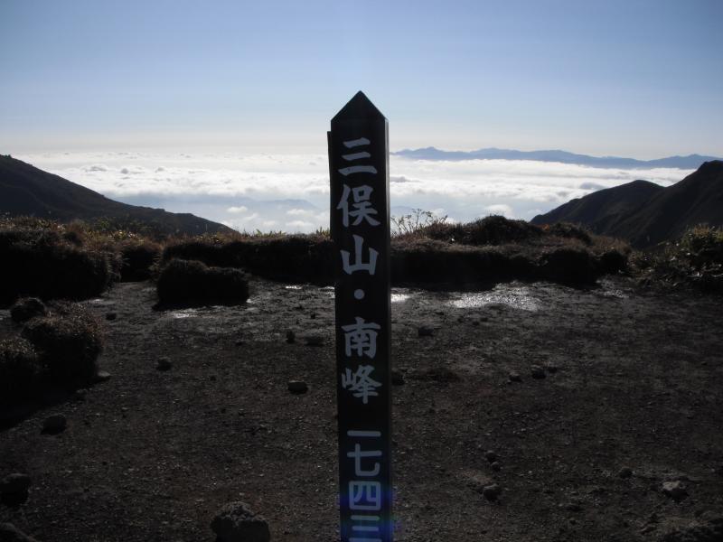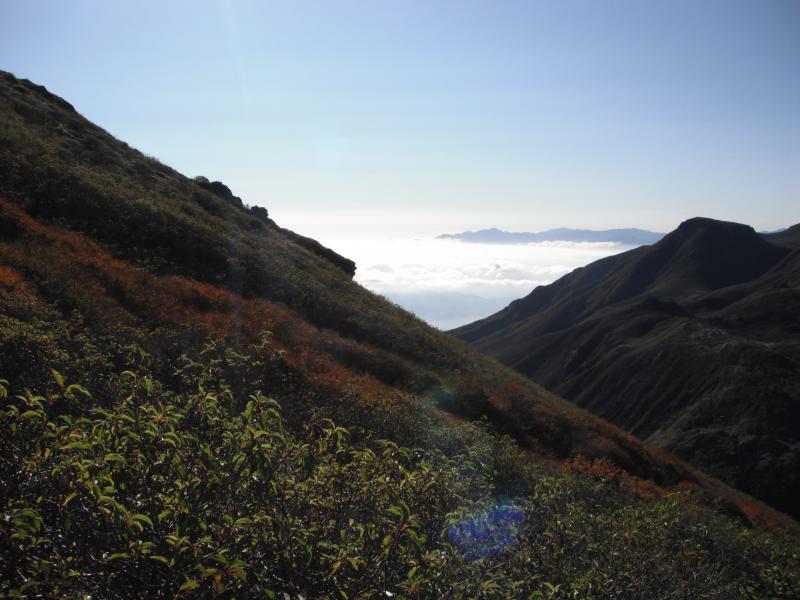 諏蛾守越まで来ると続々と登山者が登ってきます。平日なのにお天気のせいでしょうか。三俣山へはなかなかの急登。サブザックを忘れたため、テント装備一式を背負っているのできついきつい。たくさんの踏み跡がある中で遠回りになってもなだらかな方を選びつつ登っていきます。西峰に到着し振り返ると見事な雲海が!一旦下って登り返し、最高点の本峰へ。北峰方面の紅葉が素晴らしかったのですが、聞いたところによると例年はもっときれいだそうです。