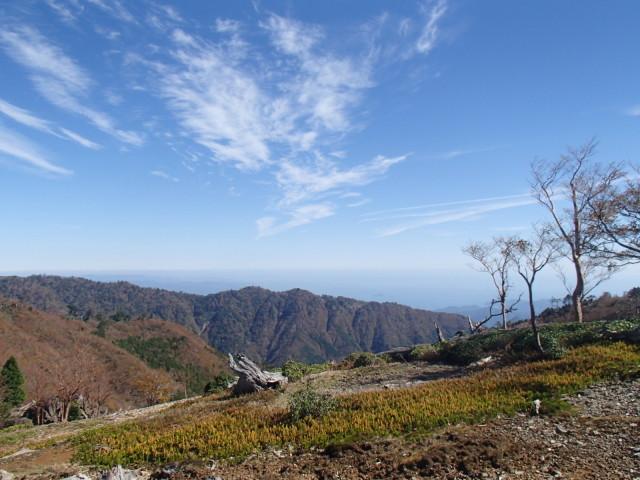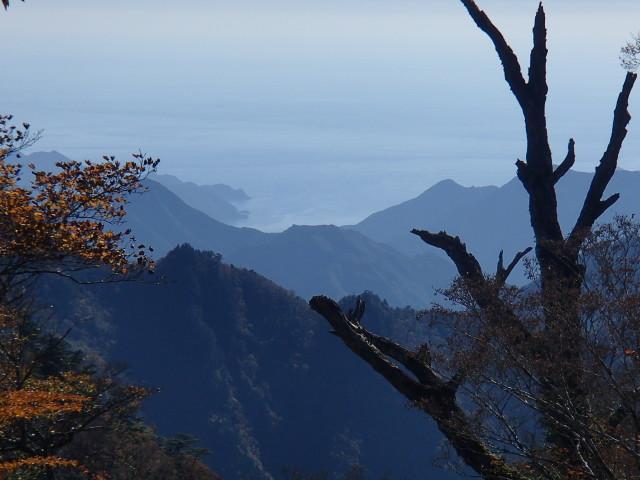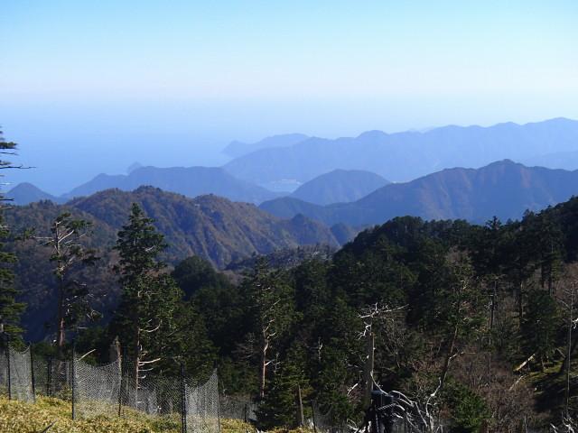 西側は竜口尾根そして大峰主稜線を中心に重なる紀伊半島の山々、東側は尾鷲の向こうに広がる太平洋。