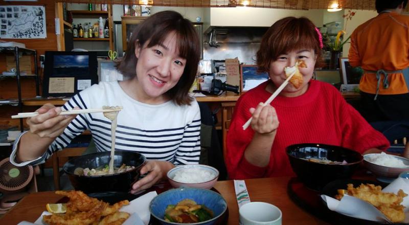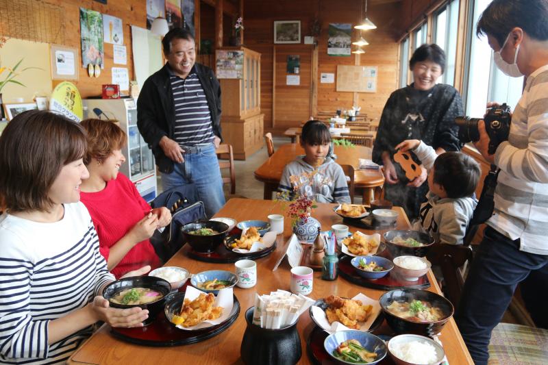 まずは徳島、神山町名物 「神山鳥」スダチでそだった鳥の天ぷらと岳人の森で取れたてのなめこのそば定食を頂きました。