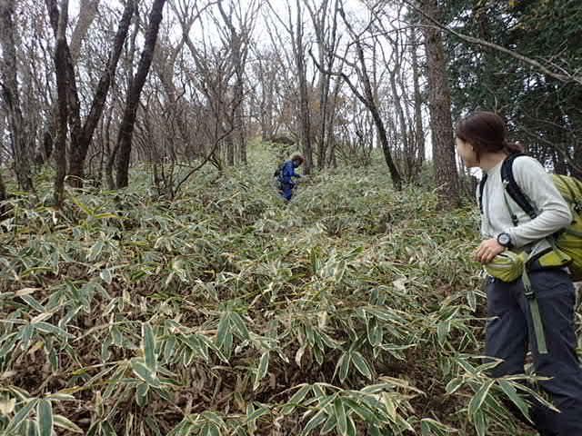 気を取り直して掃部ヶ岳へ。クマ笹の中をじわじわ進む。そして現れる階段。控えめに言っても歩きづらい。打ち明けますと大嫌いなのデス。一人ヒィヒィ言ってる間に、会長達はスイスイ進んでいく。
