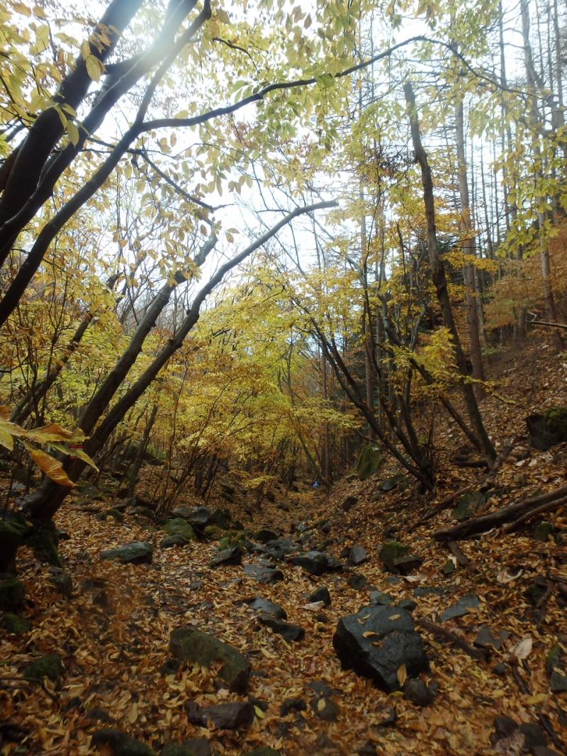 女岩を経由する谷沿いの登山道は「落ち葉の絨毯」状態でしたが、あたり一面が紅葉に染まっていて癒されました。