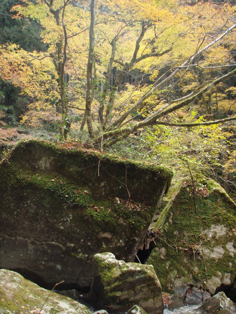 千手滝、布曳滝、縋藤滝、陰陽滝を経て、百畳岩に到着。撮影や寄り道するとコースタイムの倍近く掛かります。姉妹滝、柿窪滝、雨降滝、笄滝、骸骨滝、斜滝、荷担滝、雛壇滝、夫婦滝、琴滝、琵琶滝を経て、最後の岩窟滝に到着。休憩後に百畳岩まで引き返すと長坂山トレッキングコースへ。