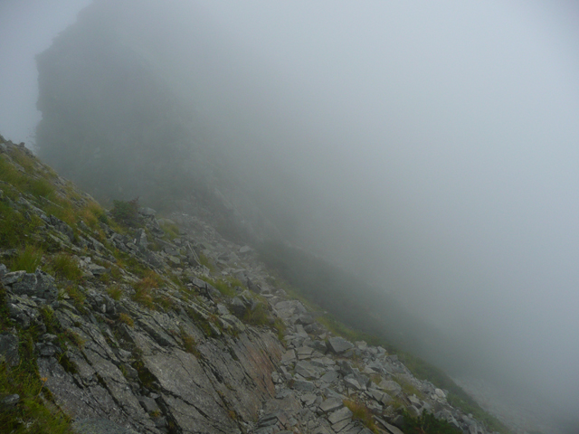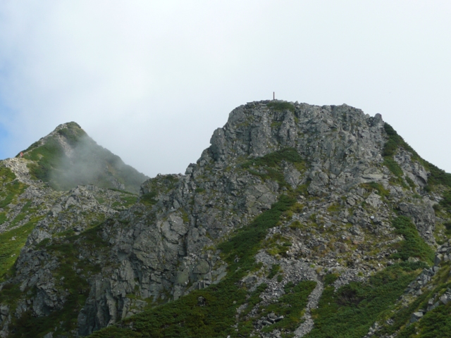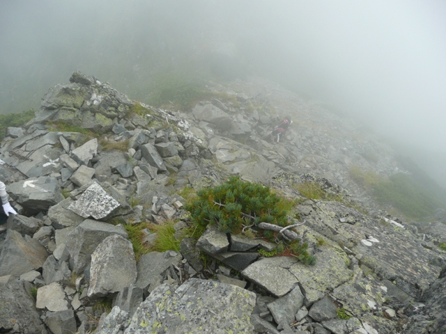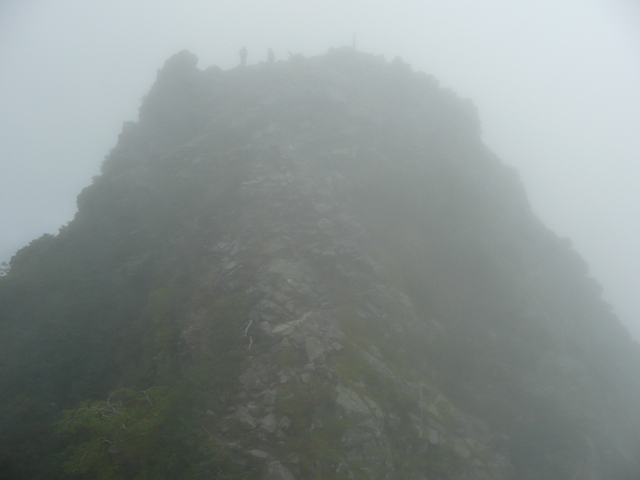 独票から先は手足の置き場をしっかり確認して慎重に。 この日の山頂ではガスがかかり、朝一番のロープウェイ(といっても8時45分ごろですが)