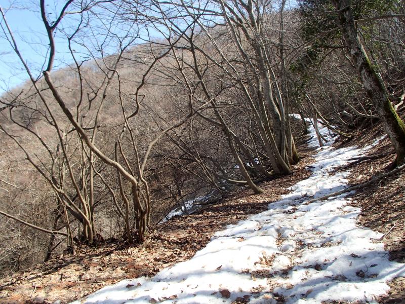 ・山頂部からしばらく下りお虎が池まで来ると雪は大分少なくなってきました。そこまでは溶けた雪も相まってドロドロ状態です・・・。