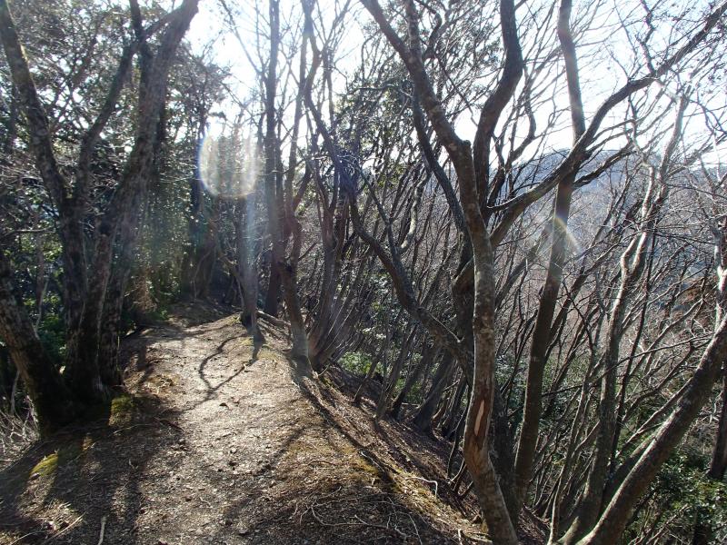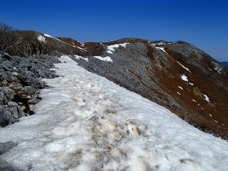 ・去年は膝まで埋まるくらいあった積雪が今年は殆どありませんでした。歩きやすい登山道を進んでいくと少し広いスペースが出てきます。この辺りで目指す霊仙山の輪郭が見えてきます。
