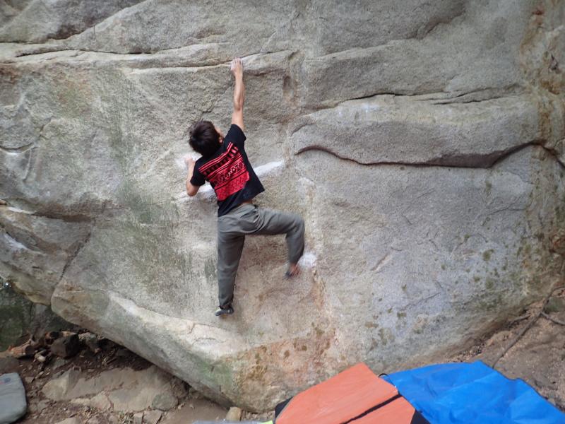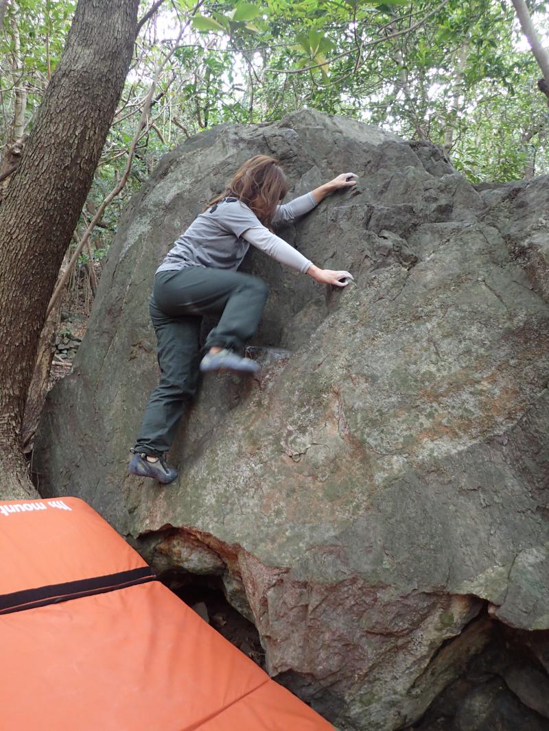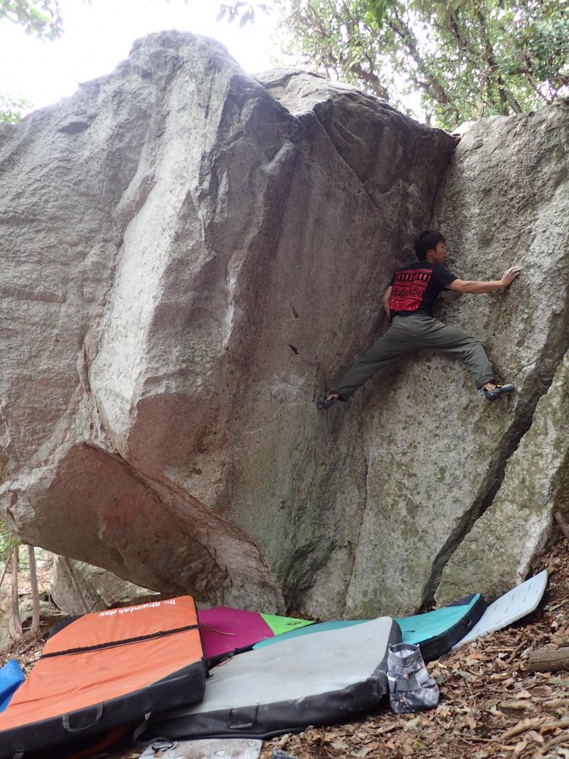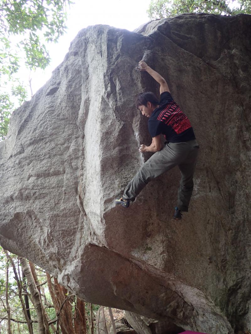 山エリアの中でも目立ちまくりの大岩、はいびすかす岩で、石田さんがハイビスカス初段にトライ。