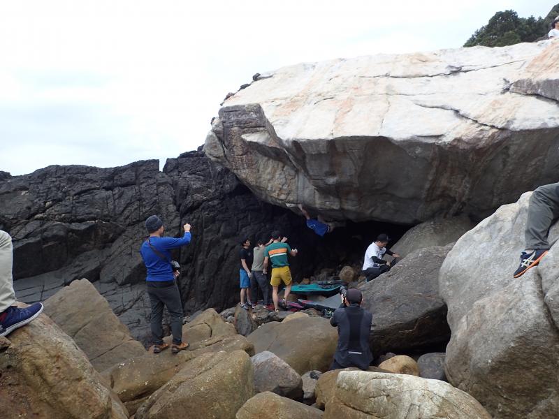 王様岩のルーフ課題や、玉座岩のハイボールに石田さんがトライ。