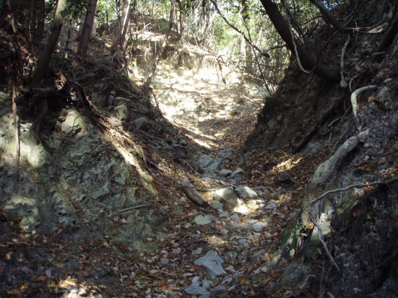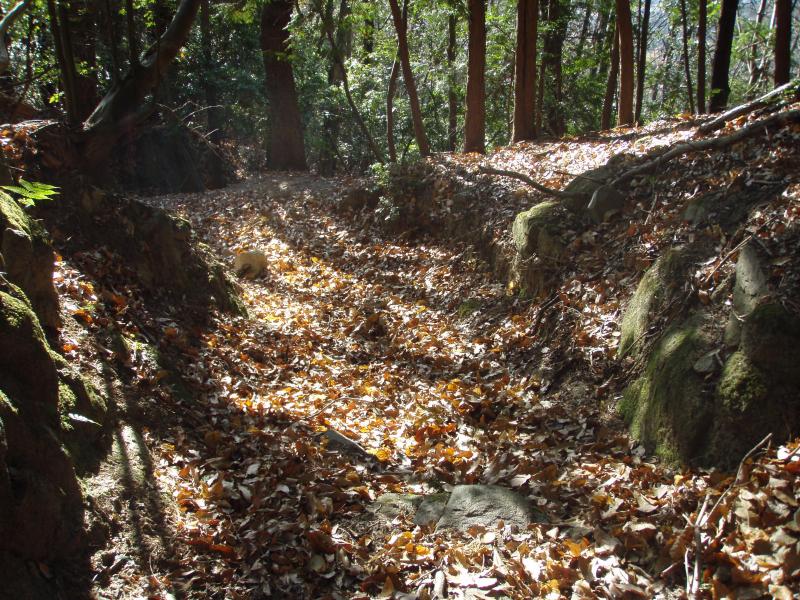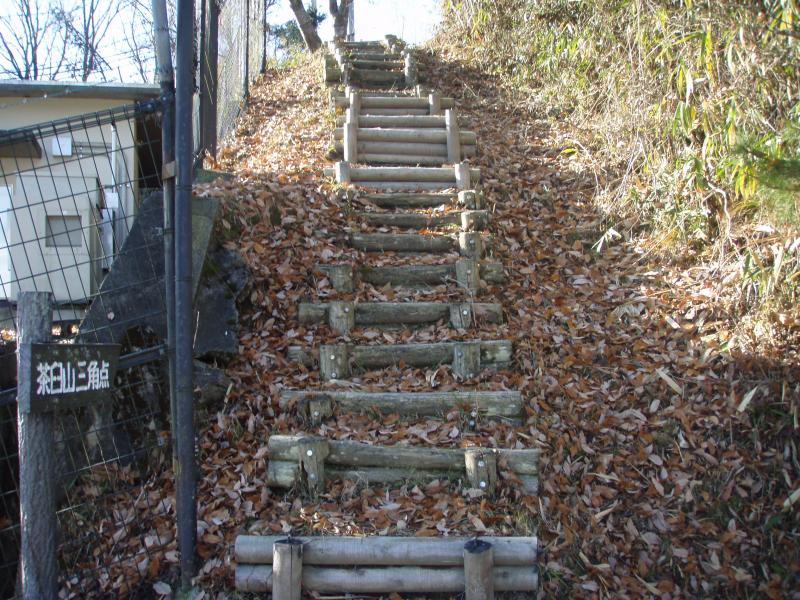 簡易舗装の道を少し歩き「茶臼山 山頂↑」の標識に従い山道へ。急傾斜の登山道は落ち葉が大量に積もっており、下に大きな石が隠れていたりするので結構歩きにくかったりします。「黒田の悪党」はこういう所に幕府軍をおびき寄せ戦ったのかもしれません。傾斜が緩くなった所で稜線の道に合流。