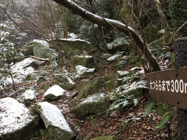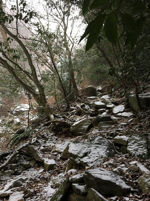 標高600mくらいからごく薄く積雪していたが、気をつけて歩けばアイゼンはいらない。