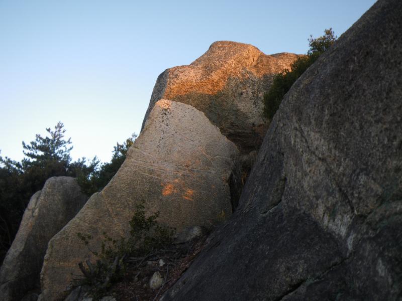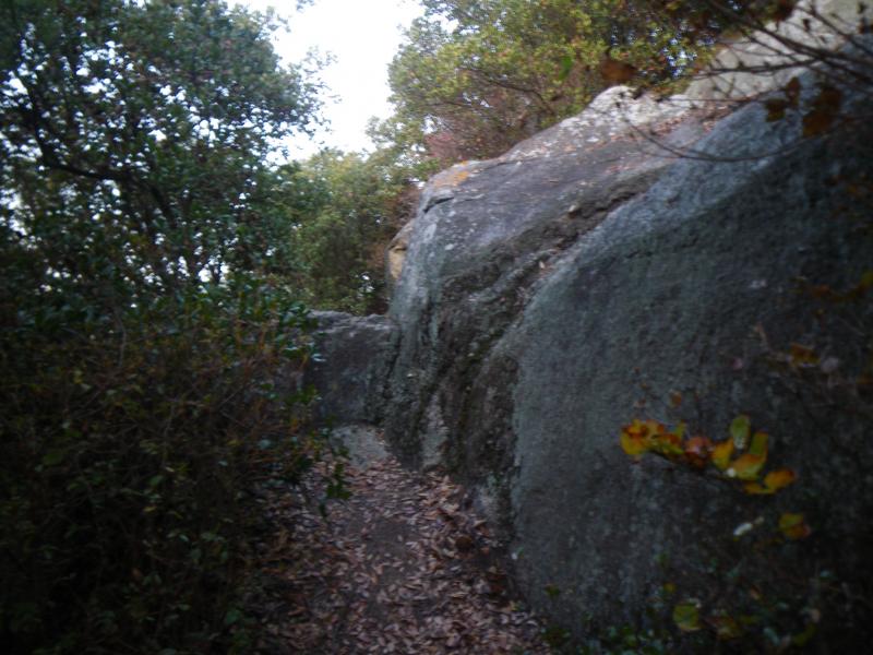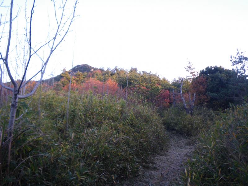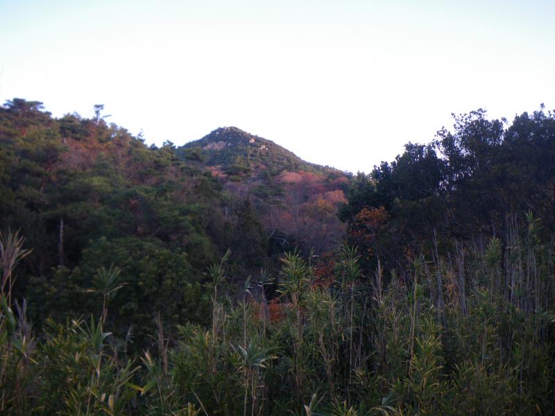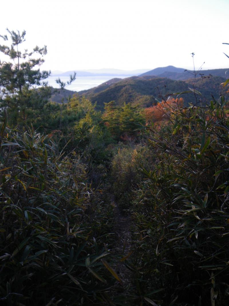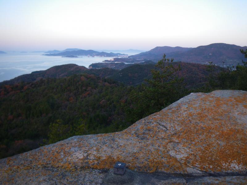 登山コースは数本ありますが、二面地区から登るコースが最短で、マイカーでゆく場合に最も登られているコースのようです。今日は3つの山に行く関係で早朝からこのコースを登りました。背の高い草で覆われている部分もあり、やや藪気味の箇所もあります。人の通らない真夏は蜘蛛の巣が張ってそうです。山頂近くの岩場は3つくらいあり、すべて岩の上に乗ることができて、瀬戸内海が正面に見えます。この山は標高が低い分、海が近く見えて、小豆島の山では最もおすすめかもしれません。