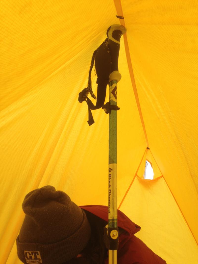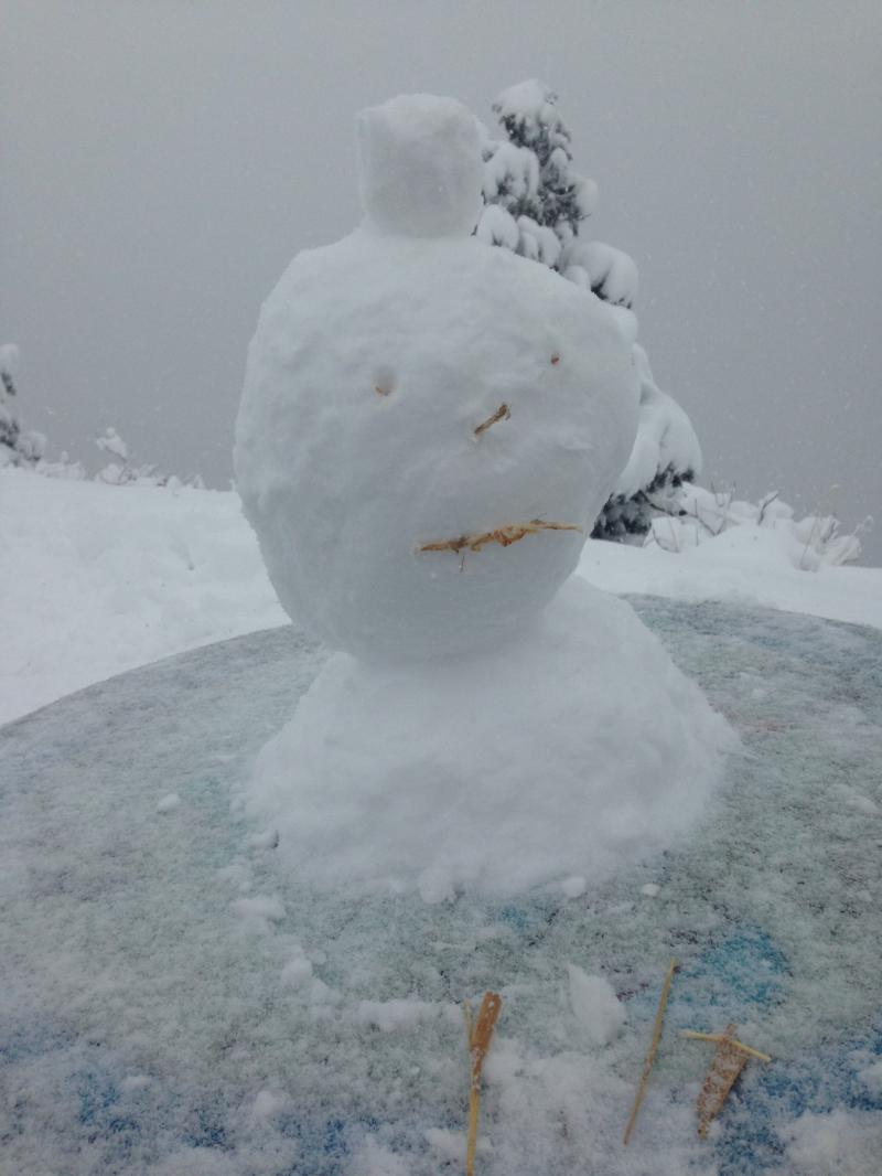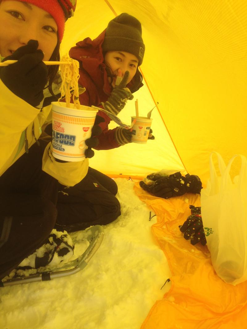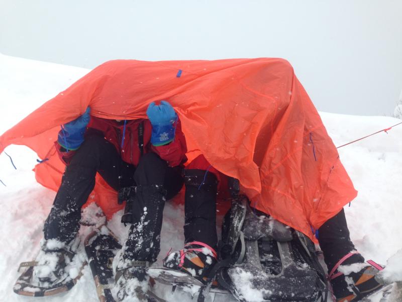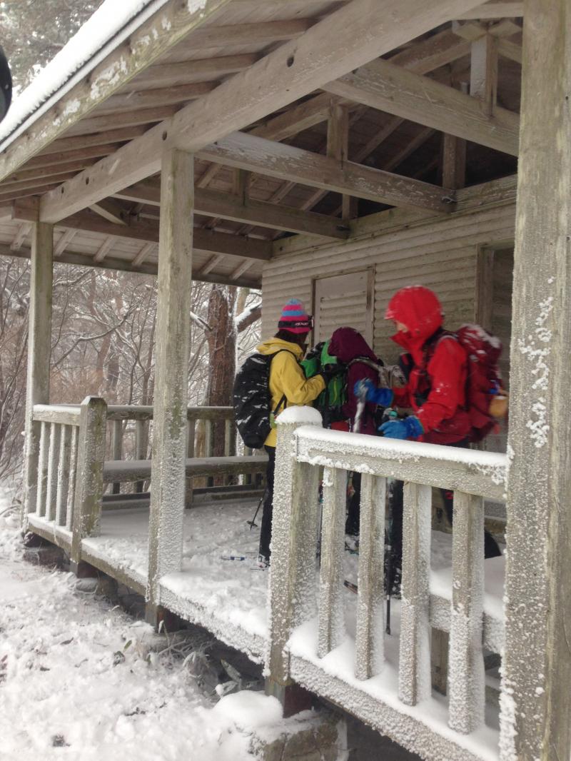 天気予報では冬型の気圧配置で吹雪かもと予想していたのですが、風は強くなく、雪も大雪でなかったので、山頂ではツエルトを張って食事をしたり、ソリをしたりと、皆さん良い経験になったようです。