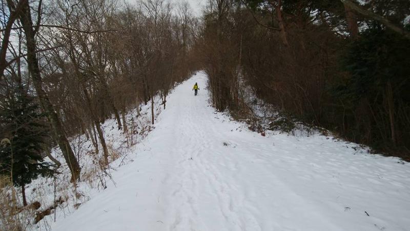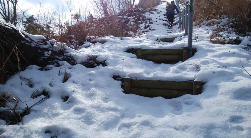 パート②舗装道に積雪のずっと急な登りです。雪があるから少し楽しい。ただひらすらのの登りの最終、剣山が見える 阿讃山脈縦走路です。