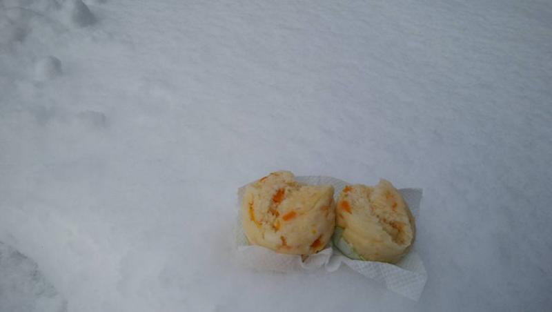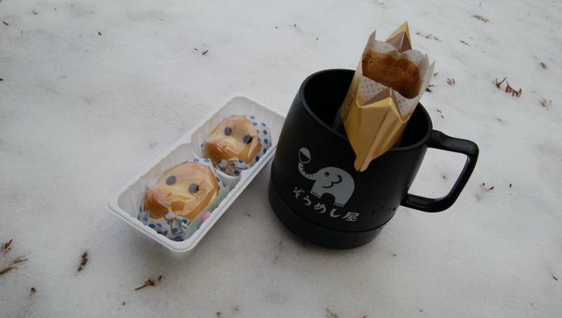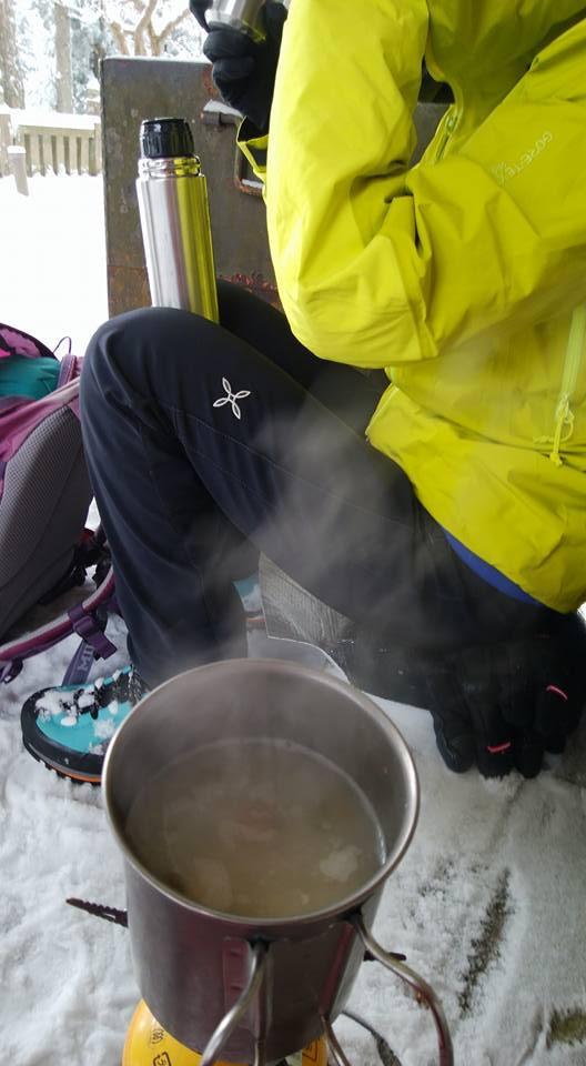 パート②の積雪の道が凍っていたら一番危ないので、少し下山を急ぎましたが、アイゼンつけずに無事下れました。下ったところではじめてゆっくり珈琲をいただきました。