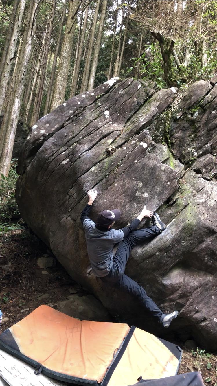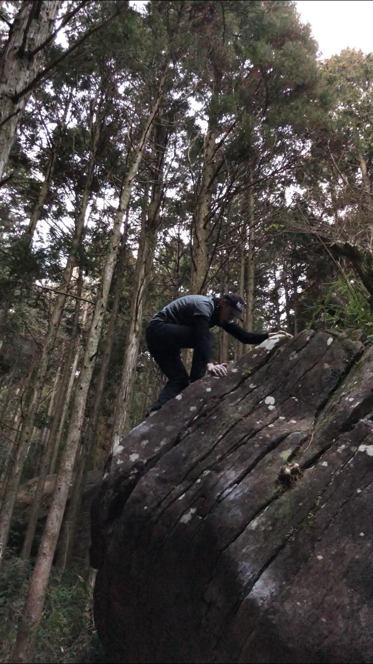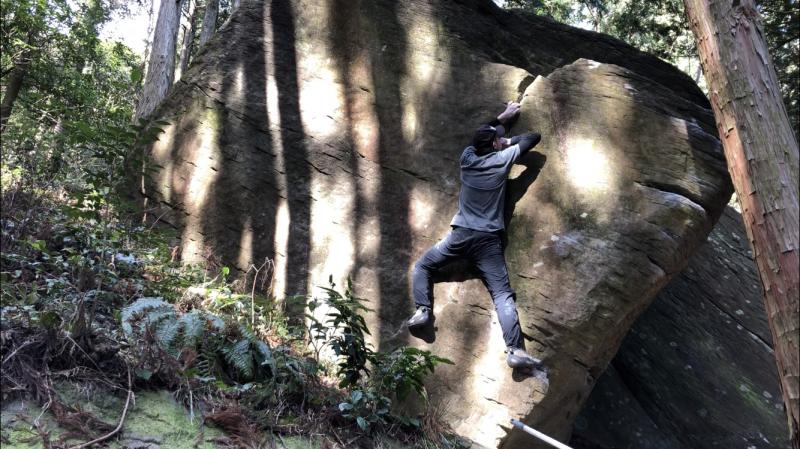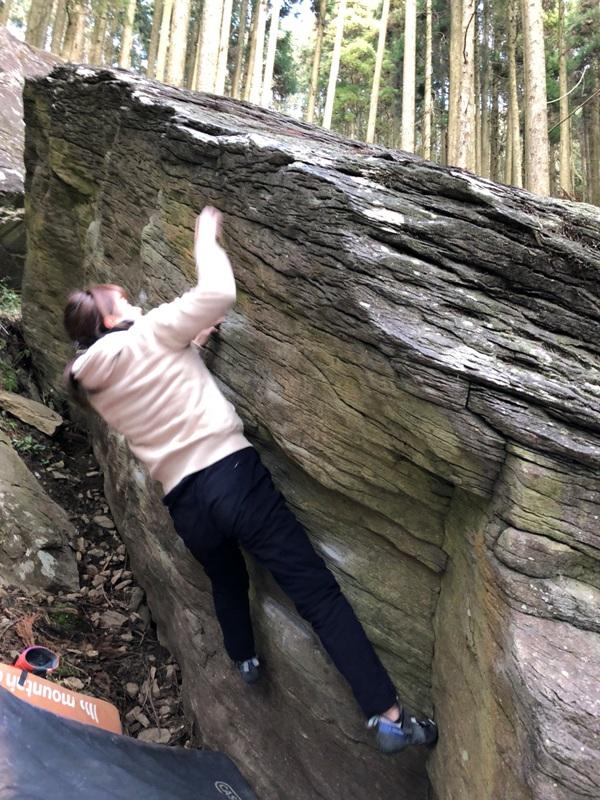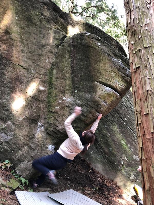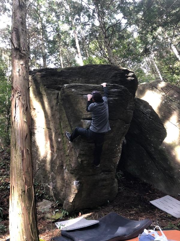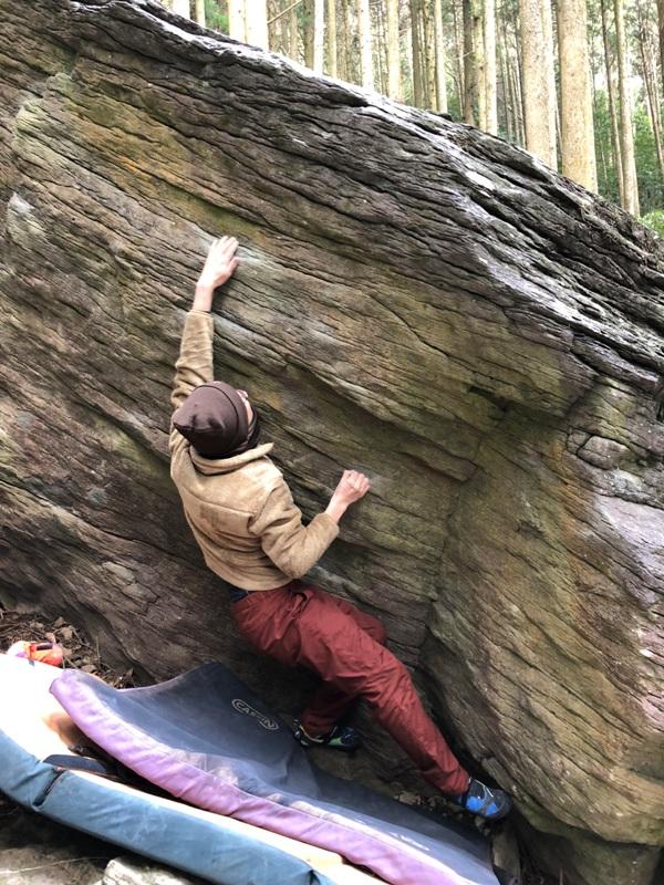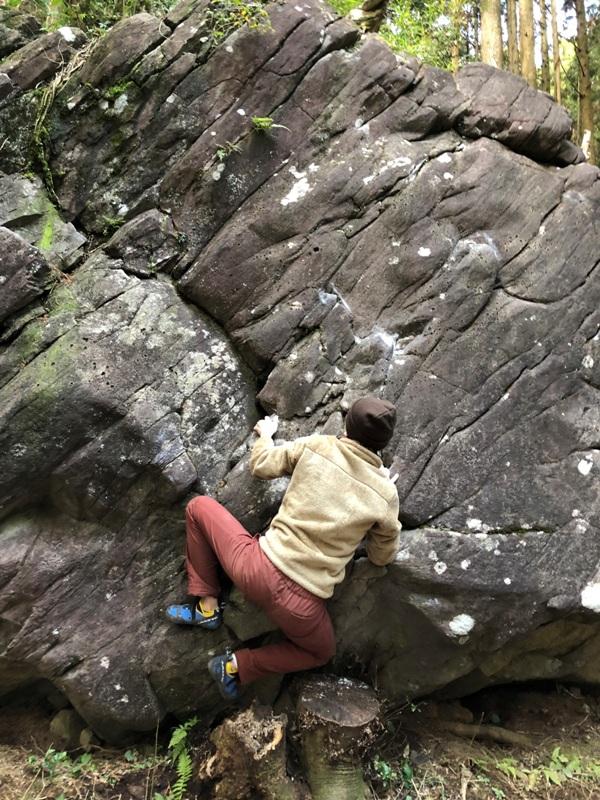 耳取峠のボルダーは輝石安山岩という岩質で特に珍しいものではありませんが、横方向に層状に溝(しわ?)が入った特異な形状のボルダーが多く、岩の傾き具合によってはその溝が斜めだったり縦になったりで、非常におもしろいです。