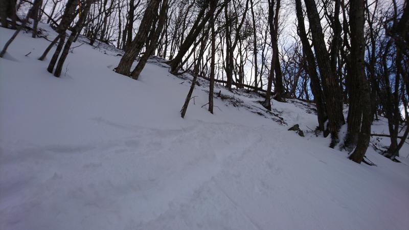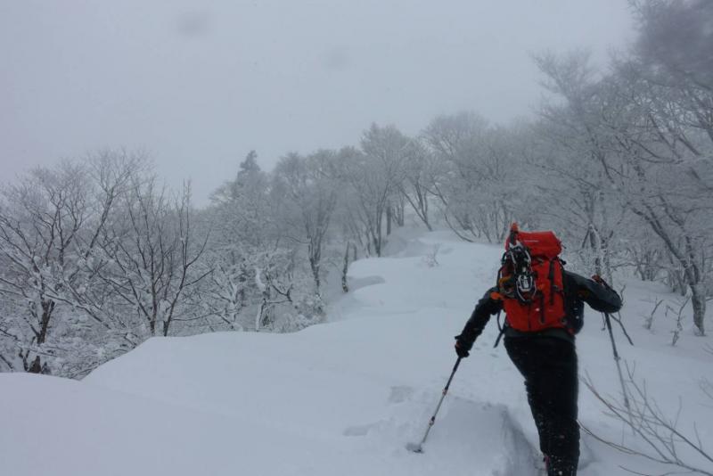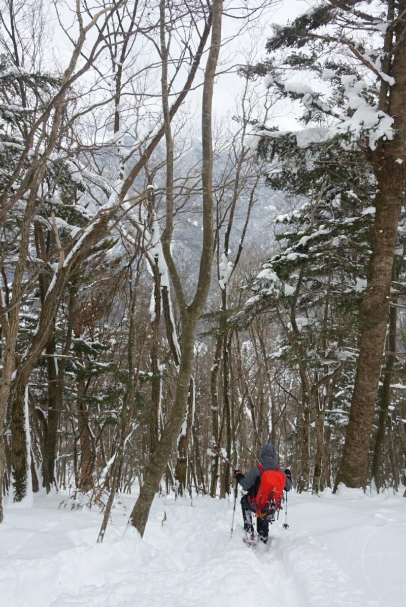 早々にワカンを装着し、稜線を目指します。かなりの斜度なので、ワカンが適していると思います。