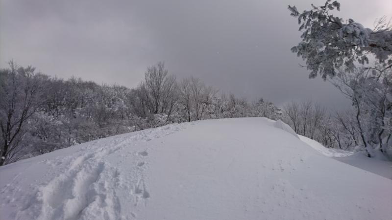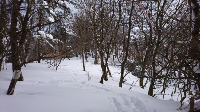 とりあえず山頂を目指そうと出発しましたが、雪が横から吹き付けかなり温度が下がって来ていたのに加え、山頂からの先行者の方の「山頂は猛吹雪。言っても何も見えない」との言葉で山頂まで500Mほどのところで引き返しました。