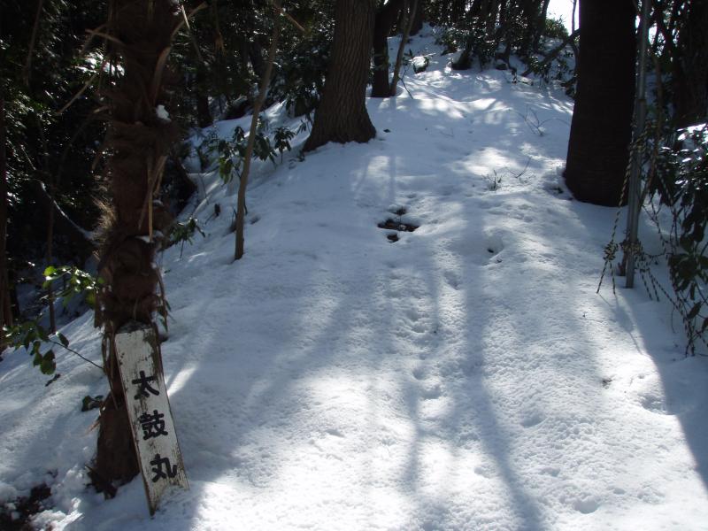 標識などはしっかり整備されていますが、足元の雪が凍っている場所もあり、冬場はしっかりした登山靴が必要です。「切通し」「西の丸跡」を経て「本丸跡」のある佐和山の山頂に到着。三角点あり、展望が開けており彦根城もよく見えます。気温4度、積雪10cm。