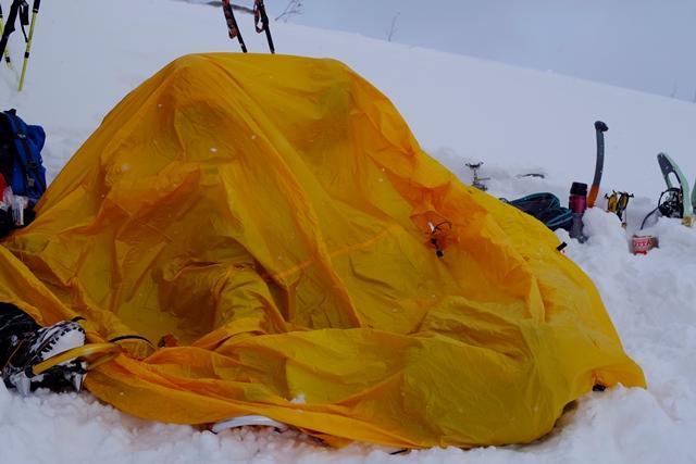 しかし、寒いので、ツエルトを被って温かく。食べ物はお湯を入れてすぐたべれる