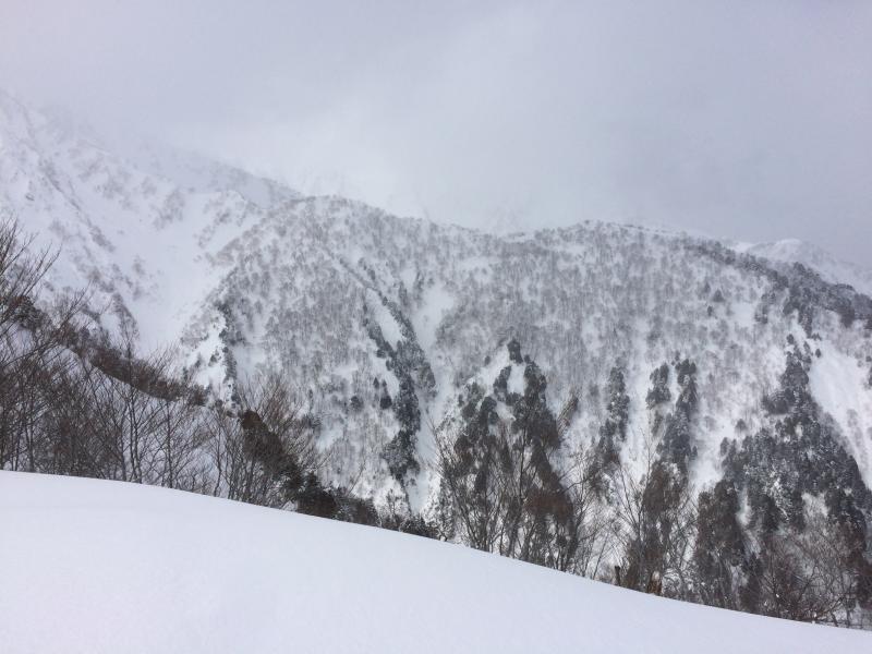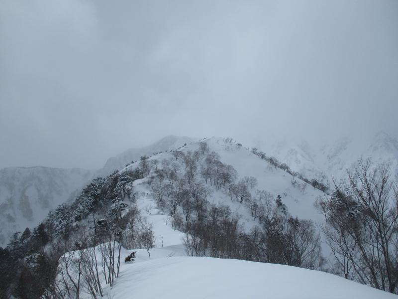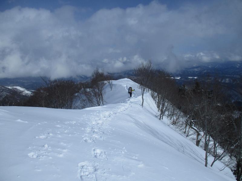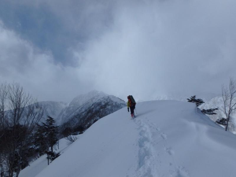 徐々に細くなる尾根とまとわりつく雪、せり出した雪庇に時折はまる腰までのラッセル。