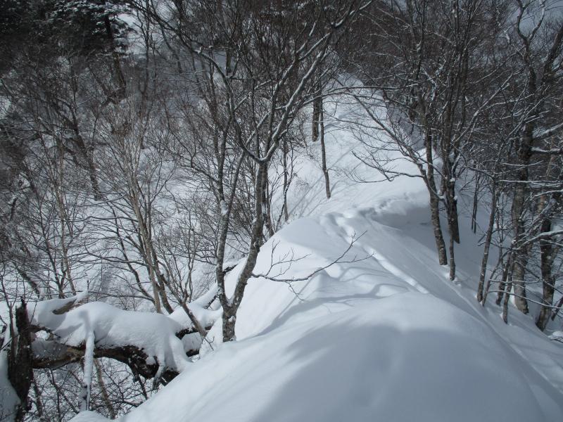 - 入山口から膝上のラッセル。尾根上は雪庇があるので悪天時は歩行注意。