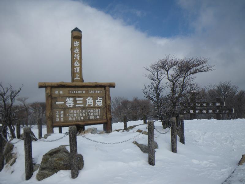 ⑫御在所岳山頂にはアゼリア前の冬は雪道になっている林道をしばらく歩くと標識があります。山頂は風がややきついです。隣の望湖台から向こう側の雨乞岳が見られます。
