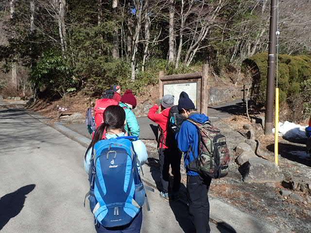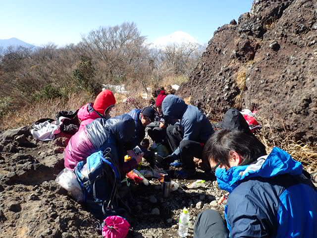 箱根湯本駅からバスの予定だが、思ったよりも御殿場アウトレットへ向かう観光客が多くて断念し、タクシーで金時神社入り口まで。ちなみにセダンタイプで4,800円。トイレが完全凍結していたり、ボトルの漏水で騒いだりしたが、ウダウダ準備して出発。