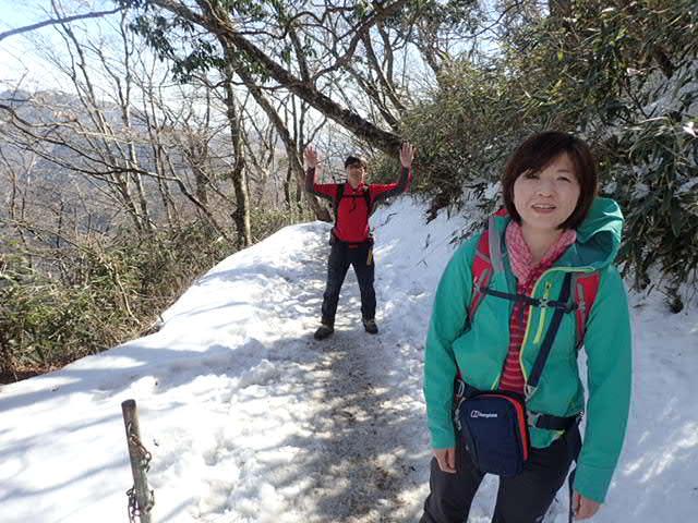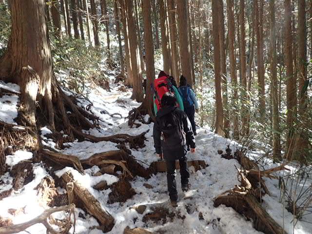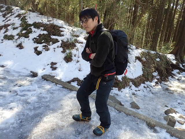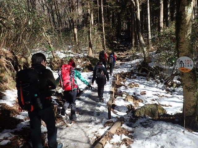 早速雪だ。この日は寒くなく、快適に歩ける。しかし、金時神社をちょっと過ぎた辺りで氷結具合が想定以上だったため、アイゼン装着を決意。6本爪アイゼンを持参したが、装着は実に5年ぶりだ。地面のザクザク感が堪らんです。松尾店長も踊るようにステップして感触を堪能しておられた。