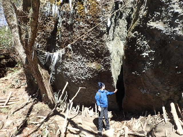 さて、日当たりの良い場所は雪が少なかったり、むしろぬかるみ具合が凄かったりしたが、アイゼンは着けたまま、宿り石に到着。大きな氷柱が何本も出来ていた。こういうの見ると壊したくなるんだよねぇ、とガツンガツンやっていたら何故か若ぇ衆から「荒ぶってる」と形容される始末。フツーですよぅ?